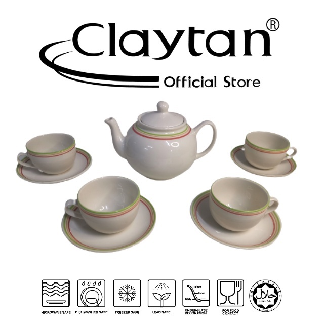 CLAYTAN 10 PCS TEA SET (4 Pax) Lead Safe Ceramic Tableware Pinggan Mangkuk Cup Teapot -BANDING GREEN