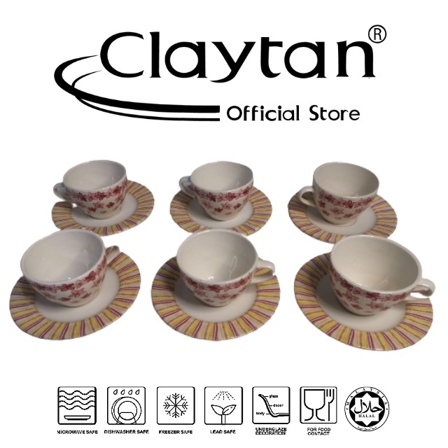 CLAYTAN 12 PCS CUP SAUCER SET (6 PAX) Lead Safe Ceramic Tableware Pinggan Mangkuk Microwave Safe - CROQUET