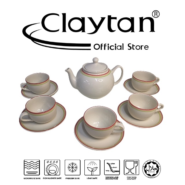 CLAYTAN 12 PCS TEA SET (5 Pax) Lead Safe Ceramic Tableware Pinggan Mangkuk Cup Teapot -BANDINGS RED