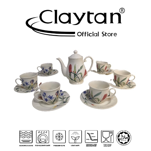 CLAYTAN 14 PCS TEA SET (6 PAX) Lead Safe Ceramic Tableware Pinggan Mangkuk Microwave Safe - WILD FLOWER