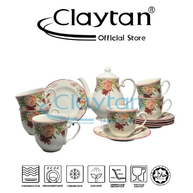 CLAYTAN 14 PCS TEA SET E (6 Pax) Lead Safe Ceramic Tableware Pinggan Mangkuk Cup Teapot -Chrysler Emperial