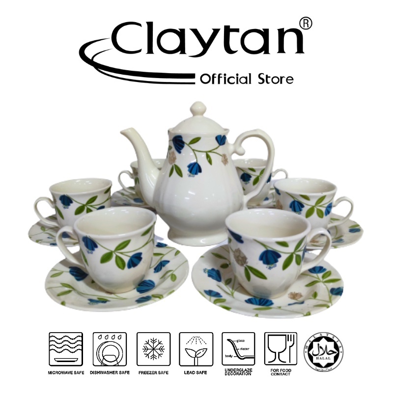 CLAYTAN 14 PCS TEA SET E (6 Pax) Lead Safe Ceramic Tableware Pinggan Mangkuk Cup Teapot -ELEGANT FLORAL