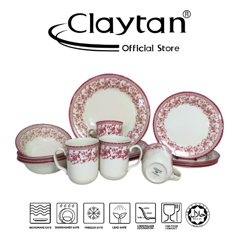 CLAYTAN 16 PCS DINNER SET (4 Pax) Lead Safe Ceramic Tableware Pinggan Mangkuk Cup Teapot - Aster Pink