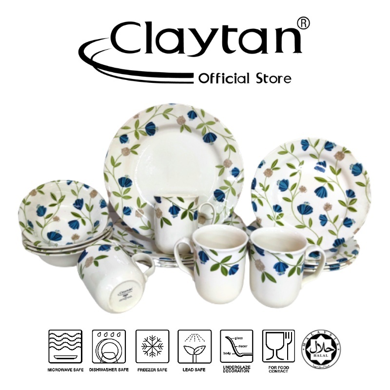 CLAYTAN 16 PCS DINNER SET (4 Pax) Lead Safe Ceramic Tableware Pinggan Mangkuk Cup Teapot-Elegant Floral