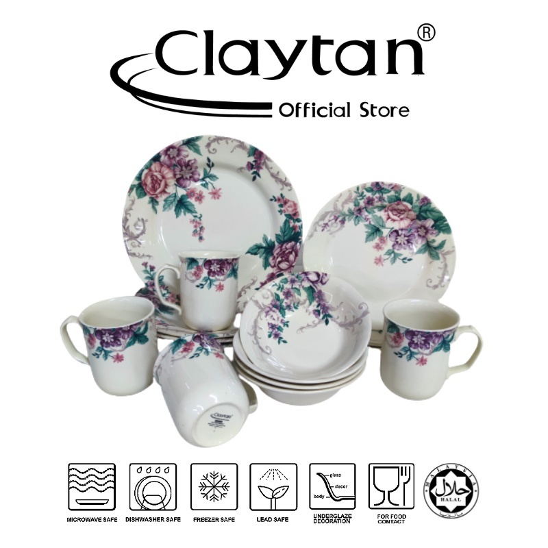 CLAYTAN 16 PCS DINNER SET (4 Pax) Lead Safe Ceramic Tableware Pinggan Mangkuk Cup Teapot -Gorgeous Full