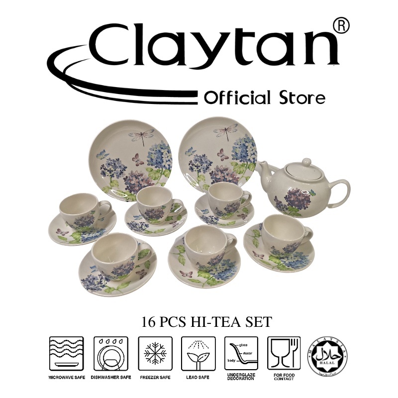 CLAYTAN 16 PCS HI- TEA SET (6 Pax) Lead Safe Ceramic Tableware Pinggan Mangkuk Cup Teapot - New Hydrangea Garden