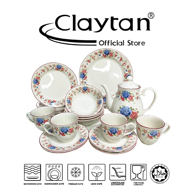 CLAYTAN 22 PCS DINNER SET (4 PAX) Lead Safe Ceramic Tableware Pinggan Mangkuk Microwave Safe -Cottage Rose w Banding