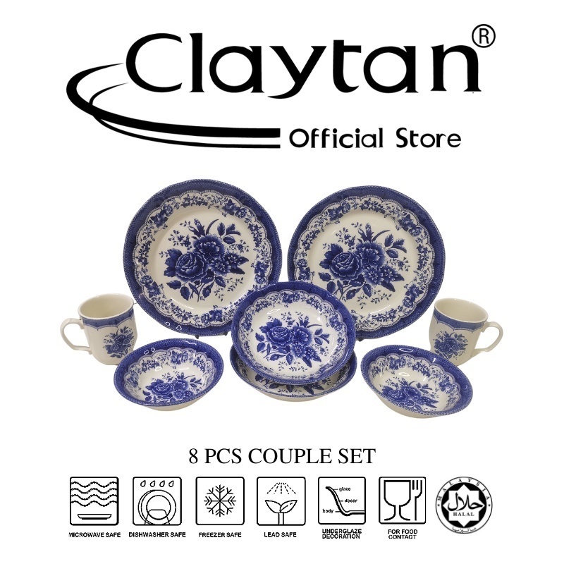 CLAYTAN 8 PCS COUPLE SET (2 PAX) Lead Safe Ceramic Tableware Pinggan Mangkuk Microwave Safe - Victoria Blue