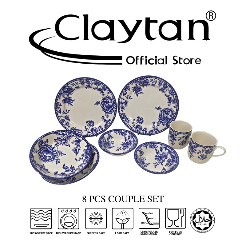 Claytan 8 PCS COUPLE SET Lead Safe Ceramic Tableware Microwave Safe - Rhapsody Blue